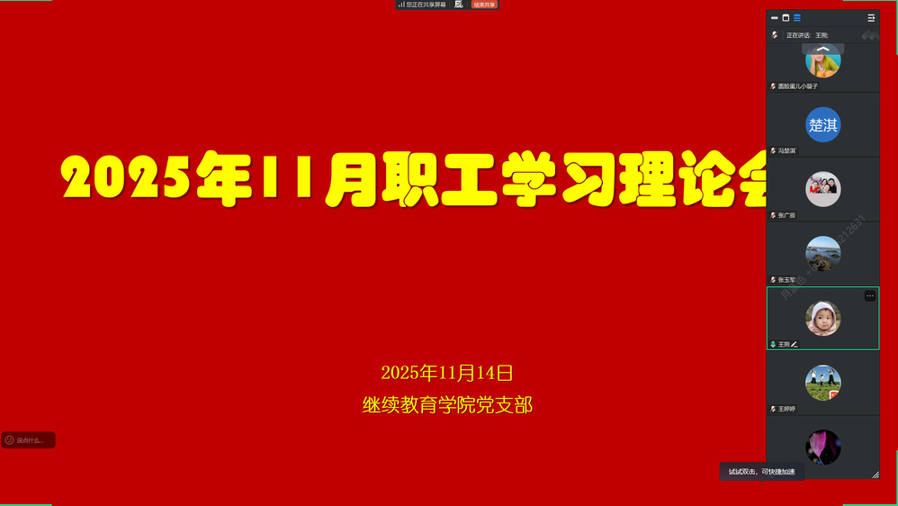 为深入学习贯彻党的二十届四中全会精神,准确把握“十五五” 时期经济社会发展的战略部署,切实把全院职工的思想和行动统一到党中央决策部署上来,2025 年 11 月 14 日,继续教育学院党支部以线上会议形式组织召开十一月份第一次职工学习会议。会议由党支部王朔主持,学院全体职工通过线上平台同步参会、同频学习。