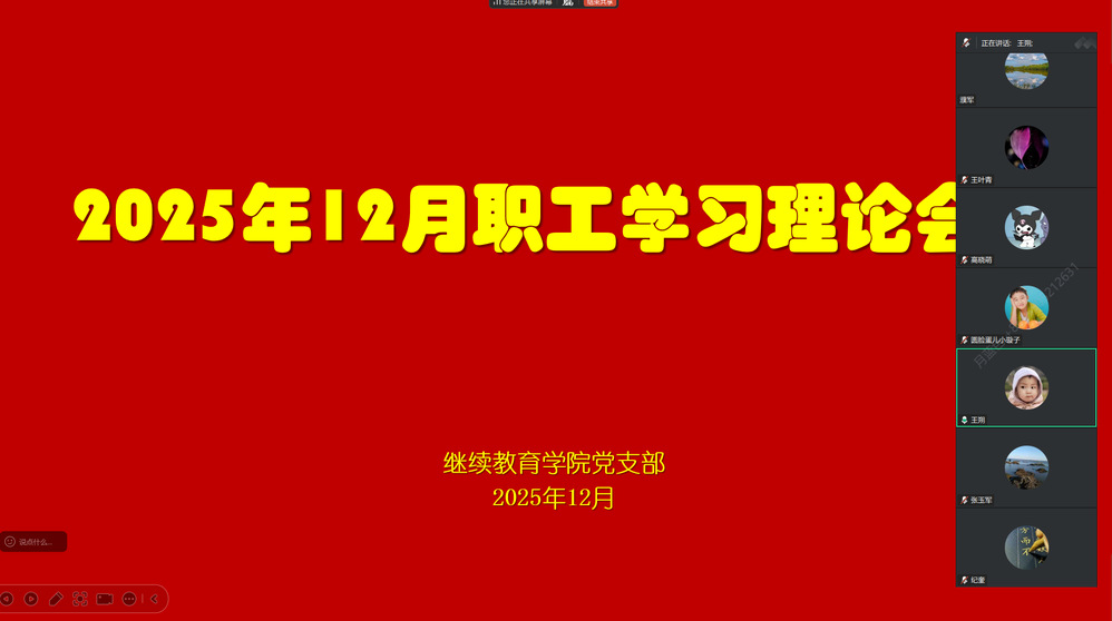 为深入学习贯彻习近平新时代中国特色社会主义思想,切实把思想和行动统一到党中央决策部署上来,2025 年 12 月 16 日下午,继续教育学院党支部以线上形式召开十二月第一次职工理论学习会议。会议由党支部王朔同志主持,全体职工参加学习。