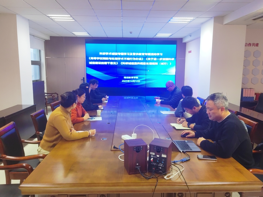 为深入贯彻落实国家关于科研诚信建设的决策部署,强化全院教职工学术道德规范意识,营造风清气正的学术环境,2025 年 12 月 12 日,继续教育学院在综合楼 914 会议室组织开展科研学术诚信专题学习及警示教育活动。本次活动由继续教育学院院长王朔主持,全体教职工参加学习。